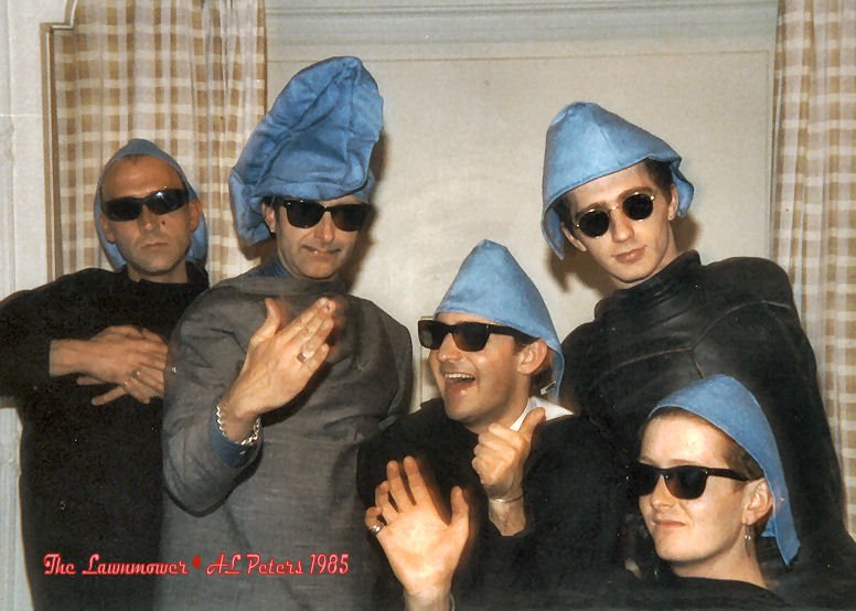 The Lawnmower at The Adelphi Hotel Liverpool circa 1985 'Beam us up Scottie' - improvised use of Adelphi seat covers Kenny Roberts (gtr) AL Peters (vcls/tpt) Mike Nelson (sax) Tony Doyle (bs) Tony Dolman (ds) |