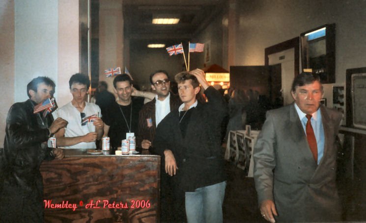Wembley Stadium The photo of the NFL President as seen above (2nd row right) shows him walkin away somewhat disgruntled havin been told that he could not get on stage and play a couple of Beatle numbers with The Lawnmower backin him. Notice Tony givin him the 'V' sign with the two flags above his head. I knew there was a revolution waitin to happen in that drummer! |